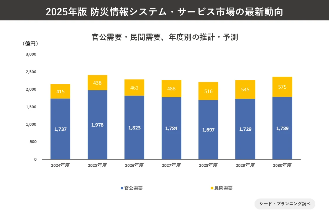 調査会社のシードプランニングによると、中間的シナリオの市場規模予測では、官公需要及び民間需要を合わせた防災情報システム・サービスの国内市場は、2024年度の約2,150億円から2025年度には約2,416億円に達すると予測されており、約12.4%の伸び率となっています。