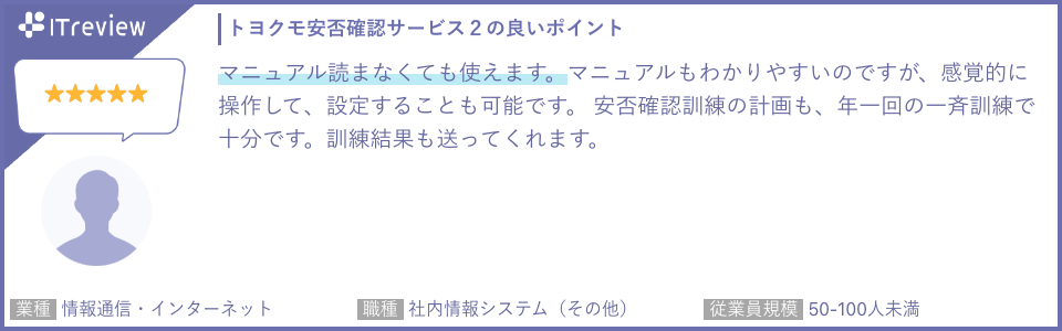 「ITreview Grid Award」とは、ITreviewで投稿されたレビューをもとに四半期に一度ユーザーに支持された製品を表彰する場です。今回2025年9月までに掲載されたレビューの集計結果を元に「ITreview Grid Award 2025 Fall」が発表され、安否確認サービス2は満足度と認知度の高い製品に贈られる「Leader」に22期連続で選ばれました。