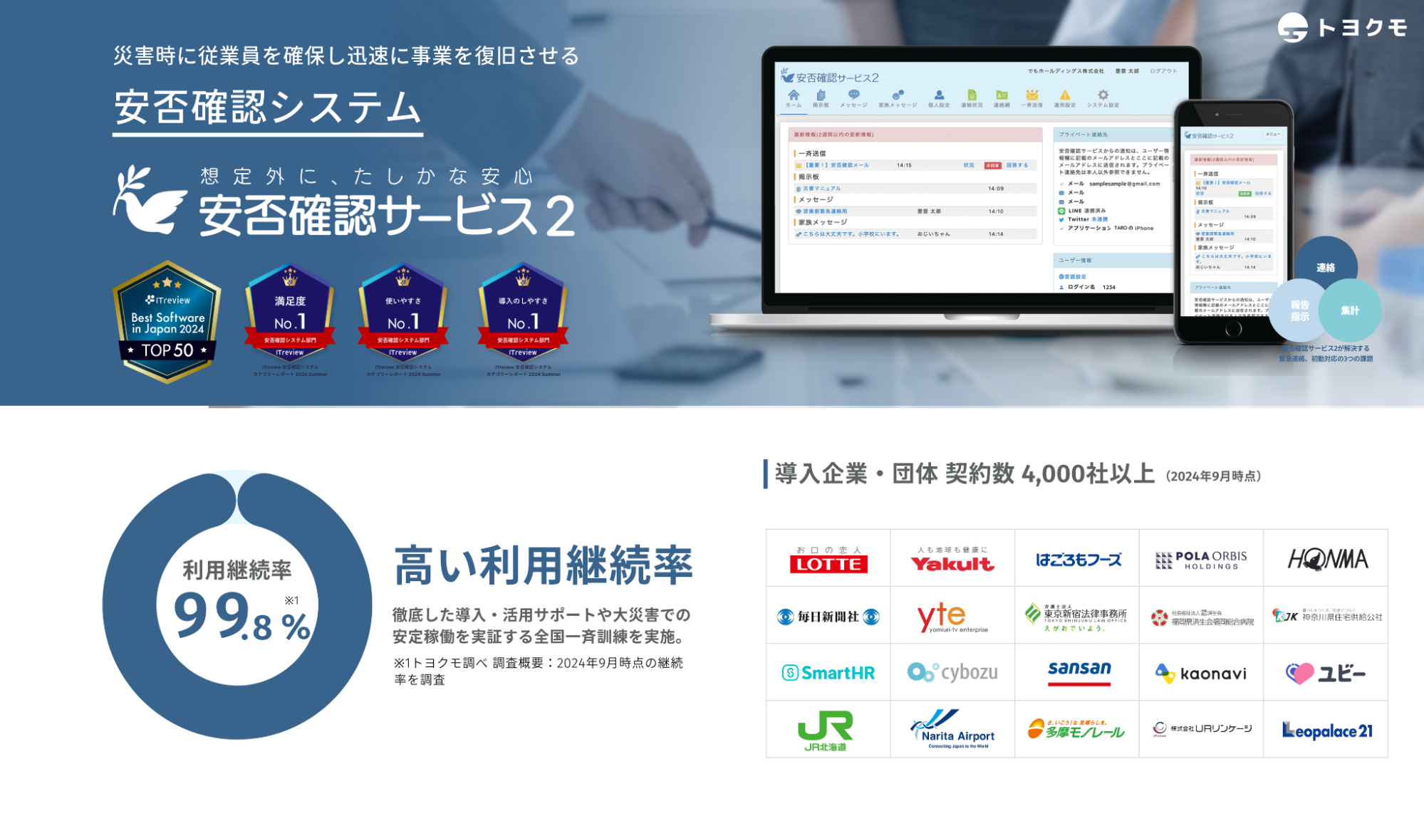 安否確認サービス2は、4,000社以上(2024年10月時点)が利用する法人向けの安否確認システムです。
