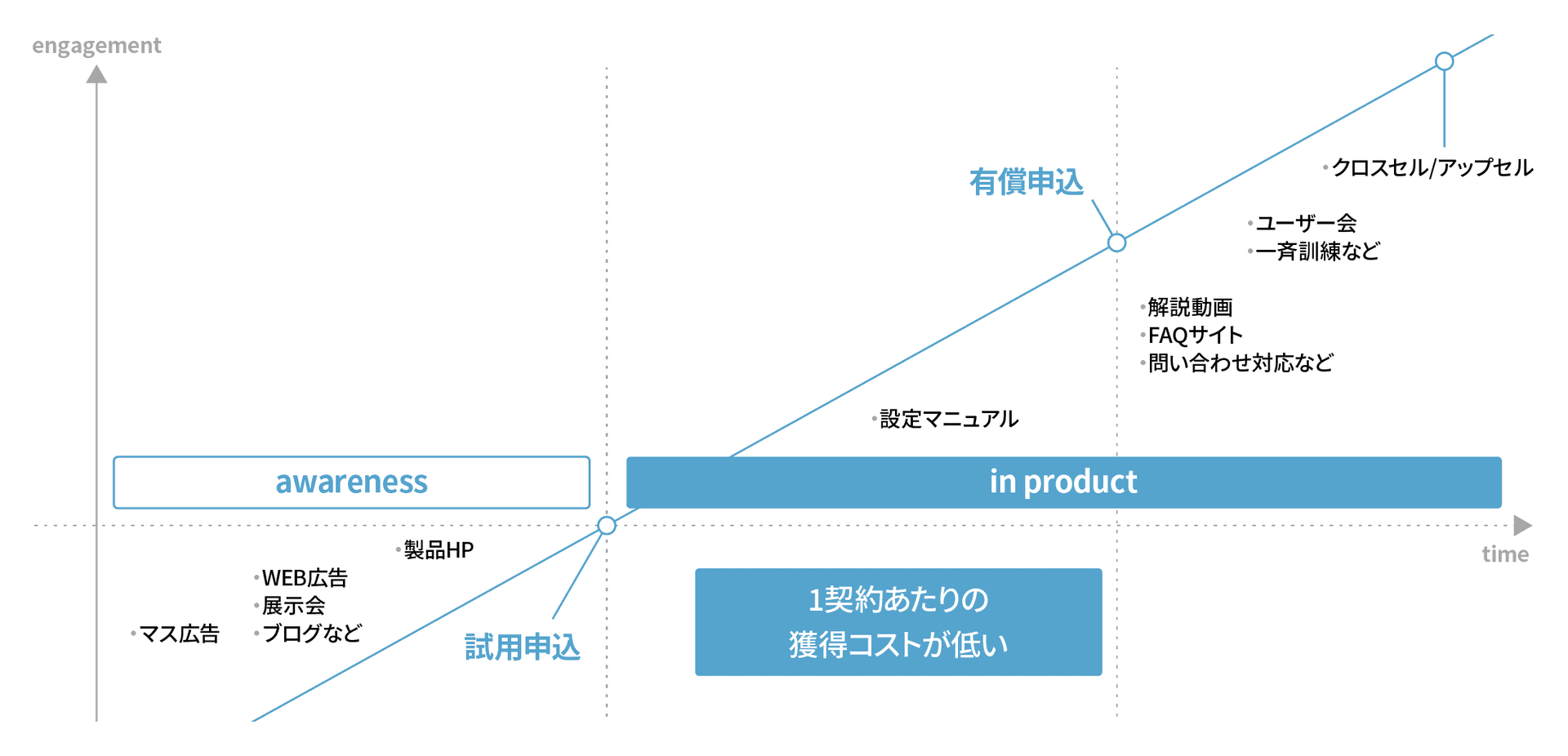 低価格でサービスを提供する企業が高収益を確保するためには、新しいサービスを開発し続けること、多くの契約を獲得することに加えて、コストを低く抑え、企業グループとして常に成長する必要があると考えています。通常、サービスや契約が増加すると、営業やサポートのコストが比例して増えていきますが、それでは低価格のサービスを提供しながら高収益を確保することは困難です。そのため、当社グループでは効率的に業務を行い、1契約あたりの獲得コストを低くするように取り組んでいます。当社グループでは、見込み顧客に対して営業が訪問し、サービスを提案するようなフィールドセールスは原則行っていません。また、TVCMをはじめとするマス広告、WEB広告をパーソナライズすることで、製品ページに訪問していただきトライアルしていただくビジネスモデルを採用しており、潜在顧客に対してメールや電話等でのインサイドセールスも原則行っておりません。このように無駄を省き、効率的に業務を行うことで、高収益を確保しています。